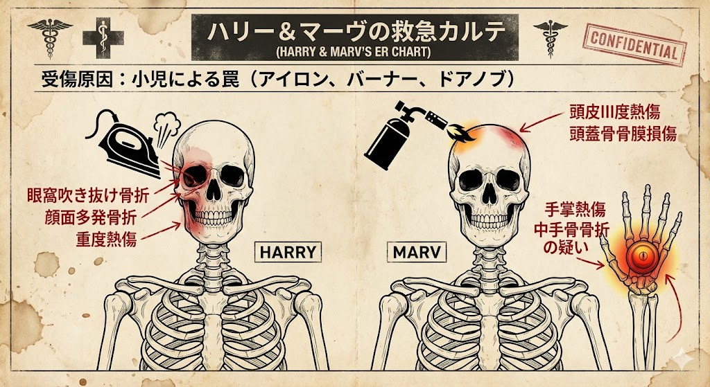 本記事では、元機械設計エンジニアである筆者が、現役医師や物理学者の検証データを基に、泥棒コンビ(ハリーとマーヴ)が受けたダメージを「カルテ」として作成しました。主要トラップの検証に加え、劇中に登場するトラップの一覧と簡易診断も併せて紹介します。